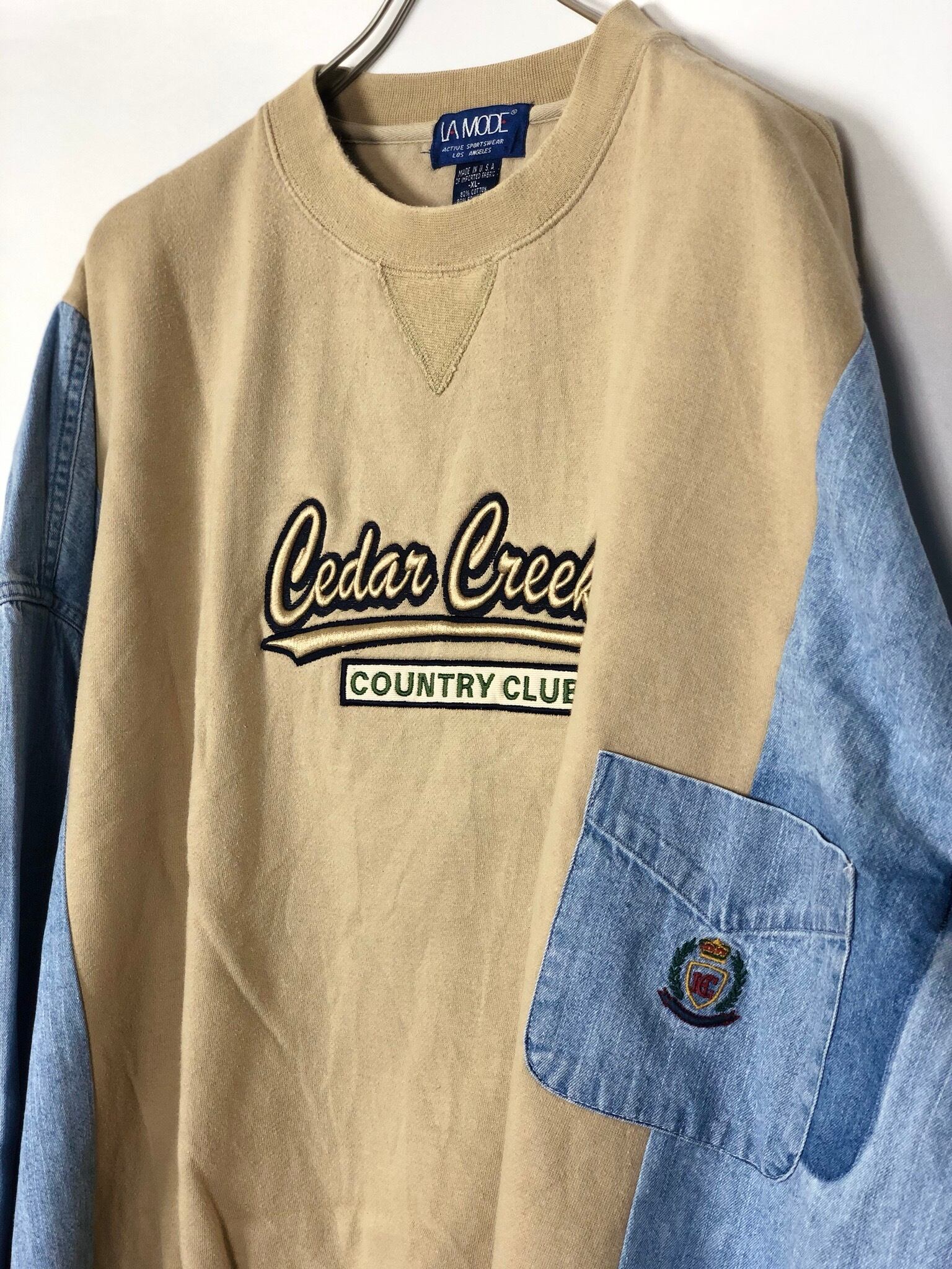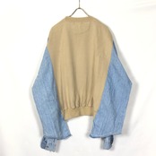 ベージュカラーのUSA製スウェットとデニムシャツ切り替え、デザイン、配色共に抜群、リメイクのクオリティもかなり高いです。